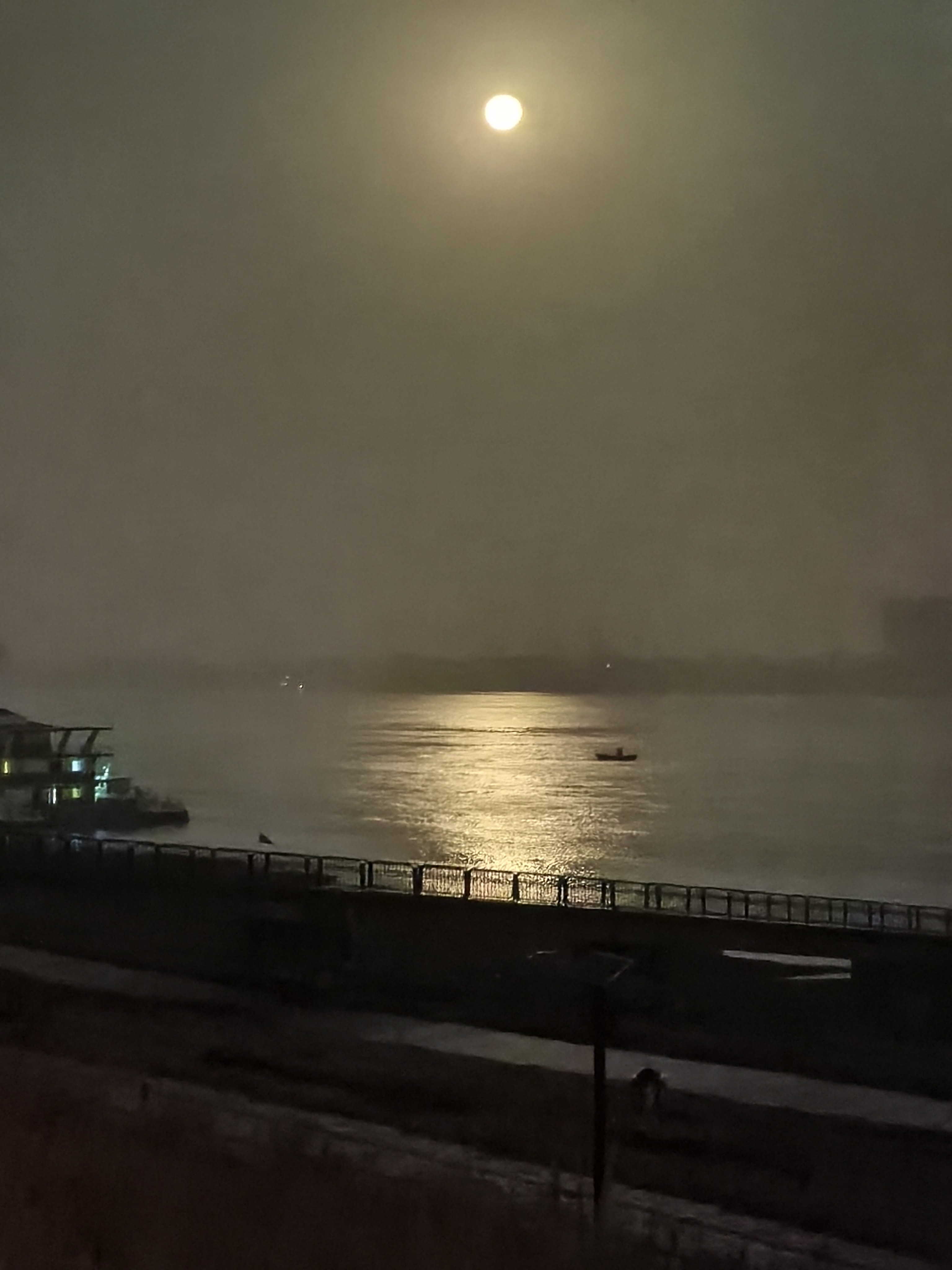 薄雾中月光撒在江面上,美轮美奂!于是用手机拍 了两张照片。回家看看还不错,于是把张若虚的诗 《春江花月夜》改了前俩句,取名《寒江晨月》: